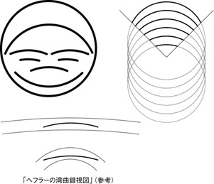 この顔にある全部の線が、コンパスのセットをし直さずに1種類の半径で描けるとは意外だったと思います。 長い額の線と短い目の線では、短い線の方が半径の大きな円弧(直線に近い線)に見える現象(トランスキー錯視)と「ヘフラーの湾曲錯視図」をヒントにして、顔にアレンジした問題です。 次の右図は、その錯視図をさらにわかりやすく説明するため同一の円を平行移動してみた図で、太線がすべて同じ半径であるのに、異なった半径の円弧に見えることが明示されています。同じく視覚的環境により同一半径の円弧が変化して見える「ヘフラーの湾曲視覚図」を下に示しておきます。 2006/3/3