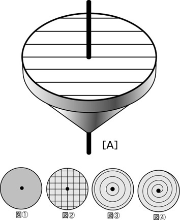 [A]のような平行線のコマが回転すると、「図3のようにに見える」が正解でしたが、表面が図2のような碁盤の目のコマも同じく図3のような同心円に見えます。ともによく見ると線と線の間が微妙にグラデーションになっています。 2006/3/13
