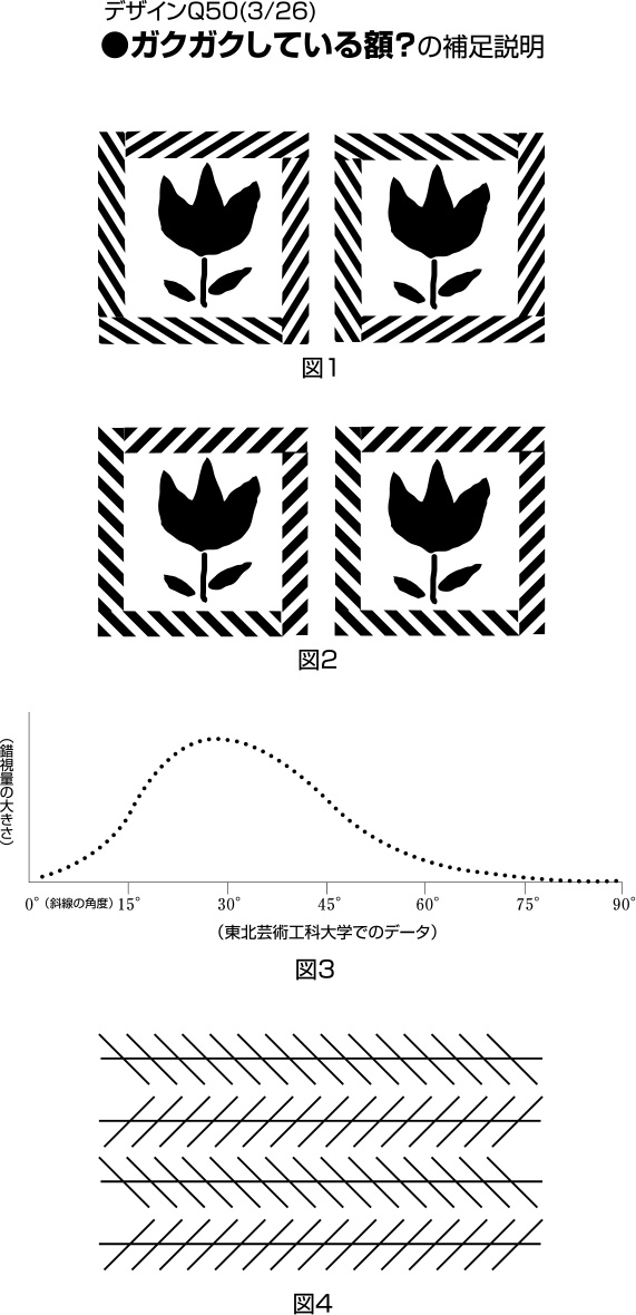 図1は出題した額ですが、図2のように斜線の角度を45度に変えると、錯視の効果はかなり弱まってしまいます。 参考までに東北芸術工科大学での角度による錯視量の変化(図3)をご覧ください。 図4は、1860年に発表された「ツェルナーの錯視図」で、平行線が斜線の方向により歪む効果が見事に表現されています。 今回の問題は、「ツェルナーの錯視図」の平行線を正方形に展開したものと考えることもできます。 ※更に詳しくは「試してナットク!錯視図典」(馬場雄二・田中康博著/講談社ブルーバックス)をご覧ください。 2006/3/28