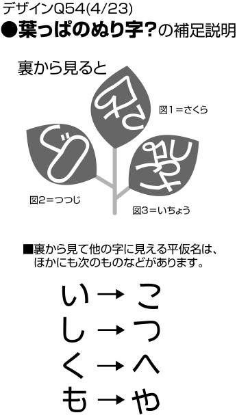 4年間(198回)お付き合いいただき、ありがとうございました。 2009/3/1 ■「文字の解剖」?(21年2/22掲載) 今回は、世界最大の5万字収録を誇る大漢和辞典(大修館書店)には、あるかも知れないと思われる漢字らしき形をつくってみました。ヒントにカタカナと入れようかと思いましたが、解答の欄に6つの□を記しましたので、文字の種類も含めて考えていただくことにしました。 ◆「デザインQを学校で時々アレンジして出していますが、大人気です。今ではクラスでクイズ係もでき、みんなで盛り上がっています。」(東京・Iさん)←(大いに活用してください) ◆「インフルエンザで作ってみました」(大阪・Hさん/茨城・Iさん)←(図で示せなくて残念ですが、お二人ともなかなかの出来映えです。みなさんもトライしてみてください) ◆「パッと見て漢字かと思い<空腹>に見えました」(静岡・Mさん)←(お腹が空いていたからだと思います) ◆「イロ(色)ノハウスだと思いました」(?ん)←(話題の言葉ですね。感心しました) ◆「日本テレビの<世界一受けたい授業>に出演していましたね。先生はもっと堅物かと思っていました」(神奈川・Kさん)←(フニャフニャではありませんが、どちらかというと軟派かも) ※ご意見・ご感想を解答ハガキに添え書きして編集部宛お寄せください。 2009/2/8 ■「県名と異なる県庁所在地」?(21年2/1掲載) 全国の県庁所在地を県名と同じにしてしまえば、一々覚えなくてもよいのにと思ったことがありませんか?。でもそうなると、金沢や盛岡のような素敵な都市名が消えてしまい、残念な気がしますね。 ◆「津、大津がすぐに解ったので、もう一つ津を探してしまいました」(神戸・Aさん)←(出題者の策略通りに考えていただき、ご苦労さんでした) ◆「私からの問題です。次の漢字がつく県名は?1.福、2.川、3.山」(札幌・Iさん)←(出題ありがとうございました。みなさんで解いてみてください) ◆「虫眼鏡、辞書、地図帳、毎週日曜日は大変です。来週は何が必要でしょうか?」(宮崎・Sさん)←(毎週切れ味鋭い参加意欲をご用意ください) ◆「毎週ちがった問題形式が面白い。殊に先週の山の名前は秀逸でした。私に褒められてもしょうがないか」(滋賀・Nさん)←(そんなことありません。読者の賛辞が励みになっています) ※ご意見・ご感想を解答ハガキに添え書きして編集部宛お寄せください。 2009/2/1 ■「山を当てる」?(21年1/25掲載) それぞれの漢字を山の形にコンピュータで変形して山の名に組み合わせてゆくこの問題は、自分でも気に入っている手法です。以前、川(20.9.21)で出題したのをご記憶ですか?。 ◆「富士山の「士」は「山」にしか見えませんが如何?」(山形・Yさん)←(山の形に変形すると、変形前は正確に「士」にしてあるのですがどうしても上の線が短くなります。) ◆「広辞苑で調べました。奥穂高岳が第3位とは。この山はまったく知りませんでした。」(神奈川・Aさん)←(第2位をご存じですか。北岳はもっと知られていません) ◆「富士山で悩まされました。多分出題者の策略通り?」(神奈川・Aさん)←(正解です) ◆「デザインQは、「理詰め」ではなく右脳を使うような感じで、難しいけど楽しんでいます」(大阪・Sさん)←(出題の意図をご理解いただき、うれしく思います) ※ご意見・ご感想を解答ハガキに添え書きして編集部宛お寄せください。 2009/1/25 ■「体内リレー」?(21年1/18掲載) 答えは「整腸薬」でしたが、「胃腸薬」とはいうが、「整腸薬」とはいわず「整腸剤」というのではないかというご意見を何通かいただきました。確かに「整腸剤」はよく耳にしますが、「整腸薬」もたくさんの製薬会社からその名で発売されていることを確認して出題しています。 ◆「答えが分かった時は、胃腸もスッキリ!さあ、夕食のしたく、頑張るぞ!」(神奈川・Oさん) ◆「このところ100%当たっています。出題者のツボが解ってきたのかもしれません」(東京・Wさん)←(見当がつけやすくなってきたということは、出題者としては望むところではありませんので、今後の出題傾向にご注意ください) ◆「難しかったです。出来たときはうれしかった。出来てしまえば難しい漢字はなくてビックリ」(岐阜・Mさん)←(なるべく難しい漢字は使わないように心掛けています) ※ご意見・ご感想を解答ハガキに添え書きして編集部宛お寄せください。 2009/1/20 ■「年賀状の忍字」?(21年1/11掲載) 新年最初の問題は、多くの皆さんが感づかれたようにサービス問題にしました。 最初は忍んでいる漢字がもっと探しにくいデザインでしたが、お正月気分で・・・。 ◆「今年も頭を捻って七転八倒・・・いえ、七転八起の精神で参ります」(群馬・Oさん)←(一字違いで随分意味が異なりますね) ◆「今日はすぐ分かりました。全然分からないときもあります。なぜかしらと思います」(岐阜・Nさん)←(それは出題者の作戦のせいです) ◆「友人の中国人の女の子の名前が迎春(エイチェン)です」(徳島・Hさん)←(おやまあ、そうですか) ※ご意