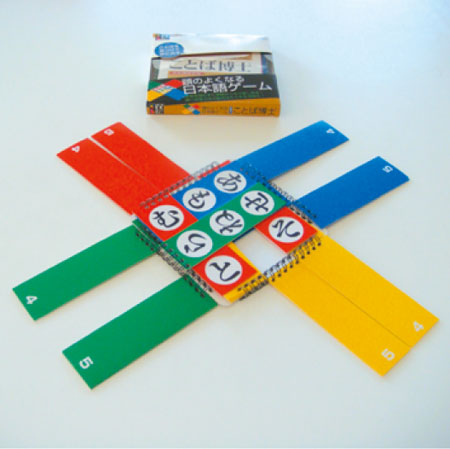 四方から短冊を出し、場に出た文字でできる言葉を素早く組み合わせて探します。