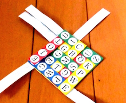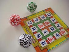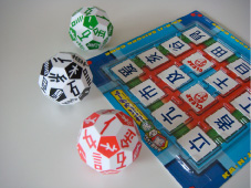 サッカーボールのような32面体の各面のプリントされた「へん」と、マス目に入っているカードの「つくり」が組み合わさるとそのカードを裏返しにし、タテ・ヨコ・ナナメの4枚が並ぶと勝ちになるゲームです。