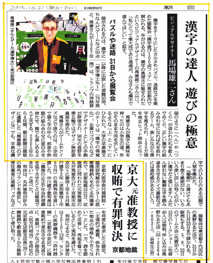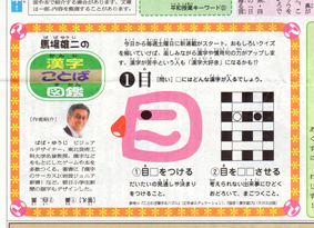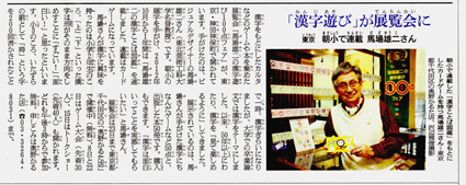 ●産経新聞の日曜版連載の「馬場雄二の遊字塾」がお陰様で700回を迎えることができ、本紙元旦の正月版で特集として掲載されました。 内容としては、2005年の入選作品からベスト5を選出し、その作者に今年をテーマにした新作を制作してもらいました。 今年は15年目になります。連載開始の頃からのベテランに加えて、新しい投稿者も順調に増加しています。益々面白いコーナーにしたいと思っていますので、解答・投稿ともよろしくお願いいたします。 (2006.1.1)