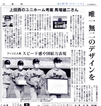 今年の選抜高校野球大会(甲子園)に初出場する上田西高のユニフォームをデザインしました。 高校野球としてはユニークだということで、新聞・テレビの取材を受けました。