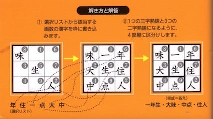 「ナンプレ」の数字を漢字の画数に置き換えて、与えられた漢字リストから選択し熟語化する、いわば「数独」を漢字の画数で楽しむように考案されされたパズルです。