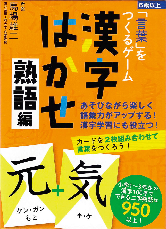 小学校1〜3年生で習う漢字から、よく熟語として使われ組み合わさる100字を厳選してカードにしました。できる二字熟語は780以上! 出るカードによって漢字の組み合わせはさまざまなので、知らない熟語を覚えるきっかけにもなります。子どもから大人まで一緒にあそべて、自然と語彙力を高めることができるゲームです。
