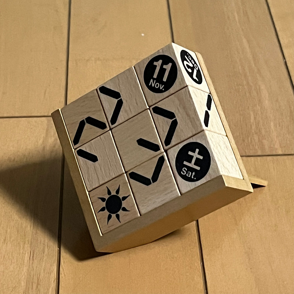 毎朝9個の木製立方体を組み合わせて、今日の日付と曜日、天候を表示する万年カレンダーです。